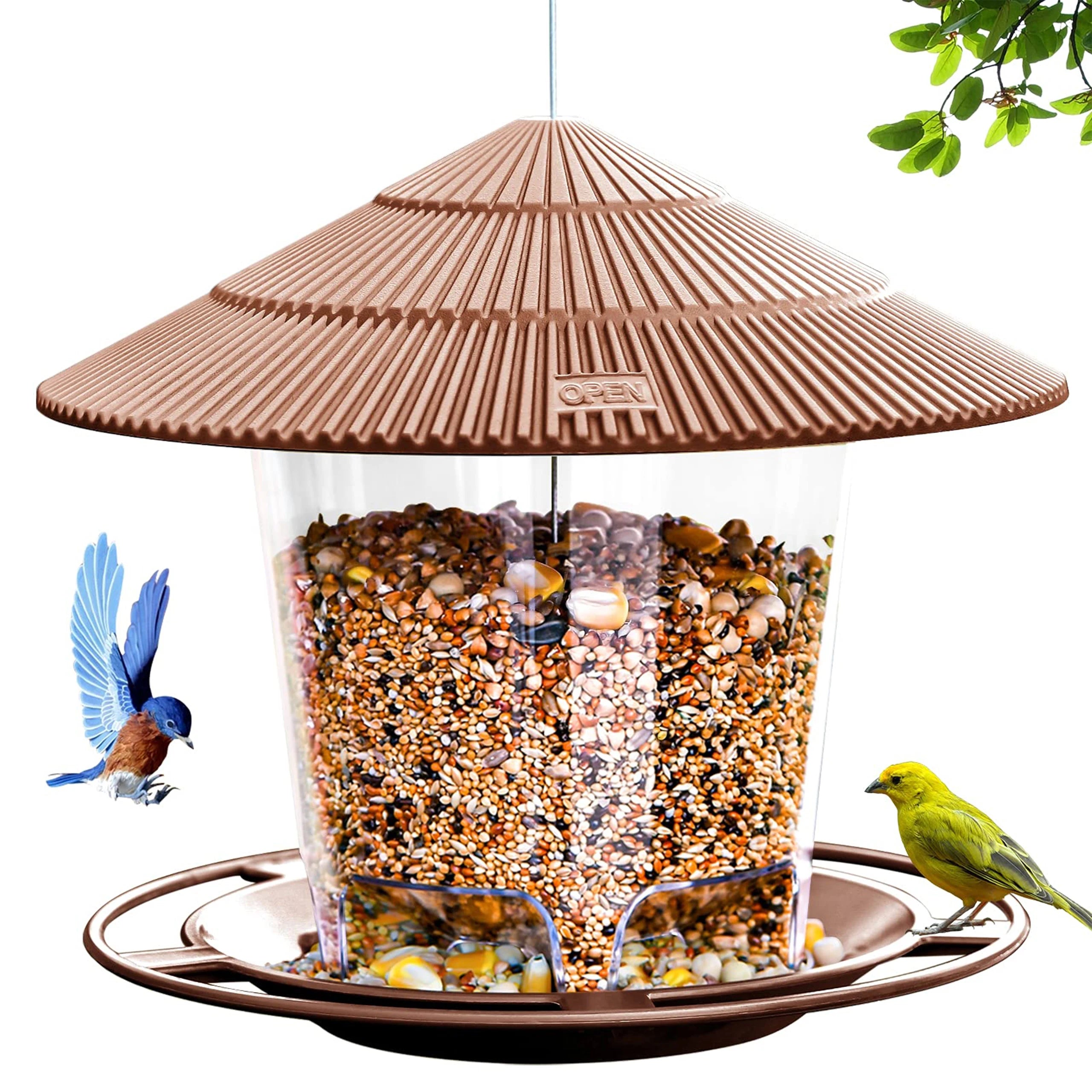 Clever Design: Inclined roof to help prevent the seeds inside from getting wet. When the seeds are eaten, more seeds will naturally fill the tray. The tray has leaking holes to avoid water accumulation, keep the bird seeds dry.