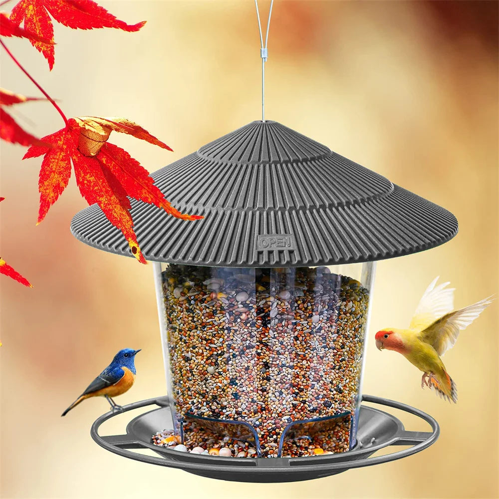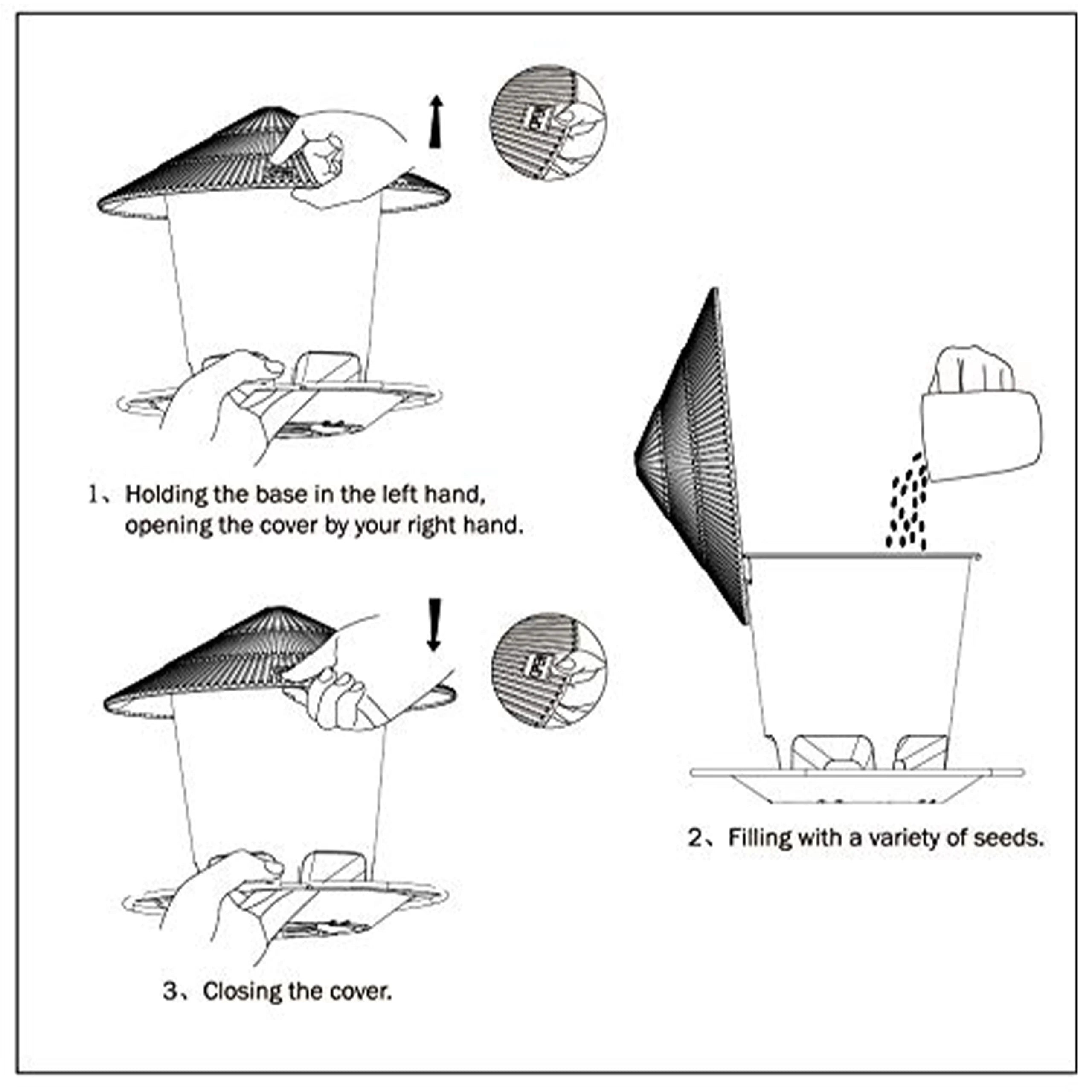 Easy to Use: Open the lid, put the wild bird seeds, sunflower seeds for birds into the bird feeder, close the lid, and then hang the bird feeder under the eaves or in the garden.